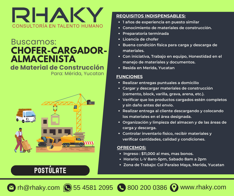 • Vacante de: Chofer-Cargador-Almacenista (Mérida, Yucatan)+ Info por WhatsApp: 👉 https://wa.link/52p89oCódigo: CHOALM2025ME003