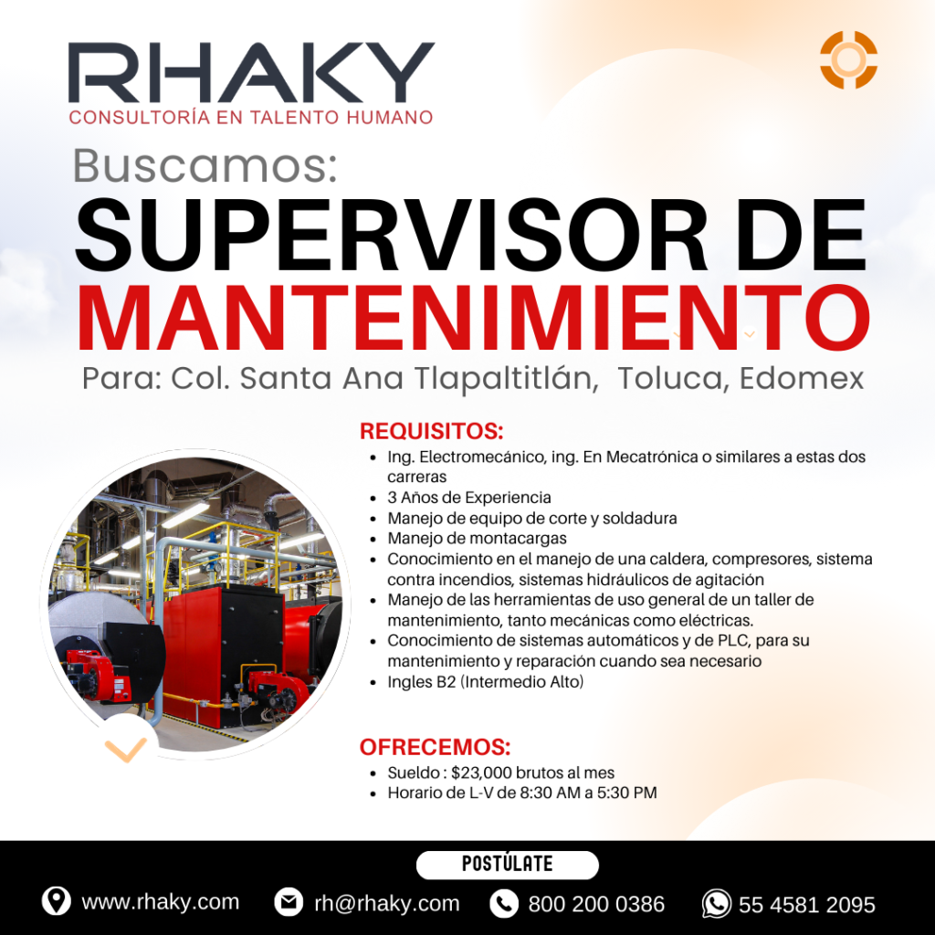 Vacante de: Supervisor de Mantenimiento (Santa Ana Tlapaltitlán, Toluca, Edomex )